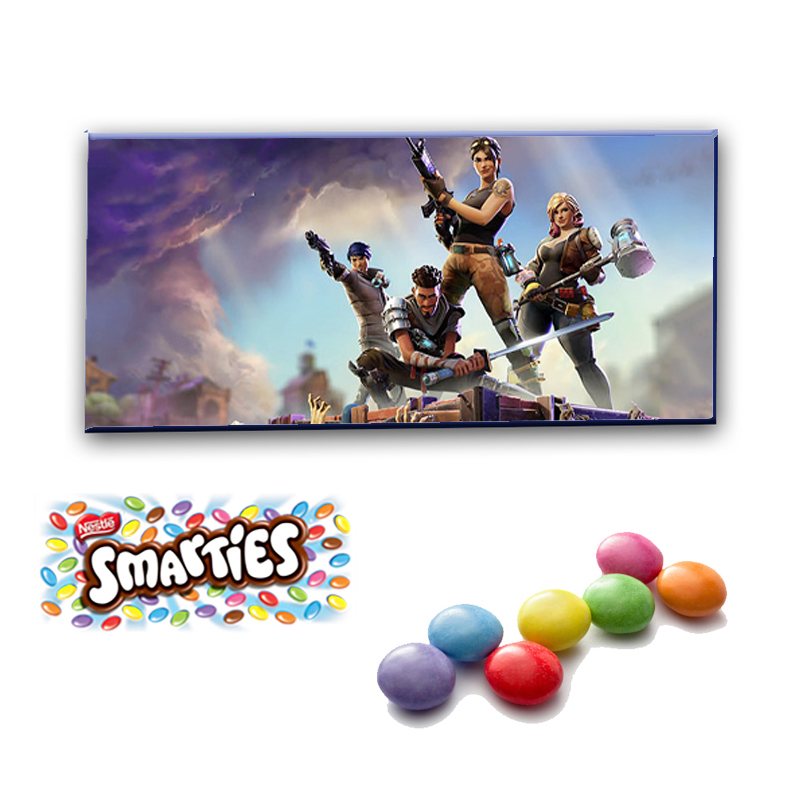 Boîte mini Smarties personnalisée. Etiquette adhésive tout autour de la boîte de Smarties d'origine avec bonbons à l'intérieur.