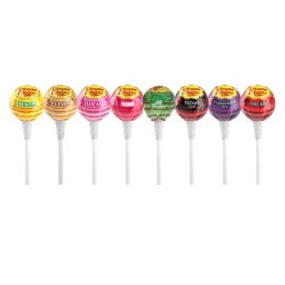 Composition : (pour sucettes goûts fraise, cerise, orange et pomme): sucre, sirop de glucose, purée de fruits (3%) (pomme, cerise, framboise, ananas, citron vert, citron, fraise, pêche, banane, orange, myrtille, mûre, mangue, pastèque, kiwi), acidifiants (acide lactique, acide malique, acide citrique), arômes